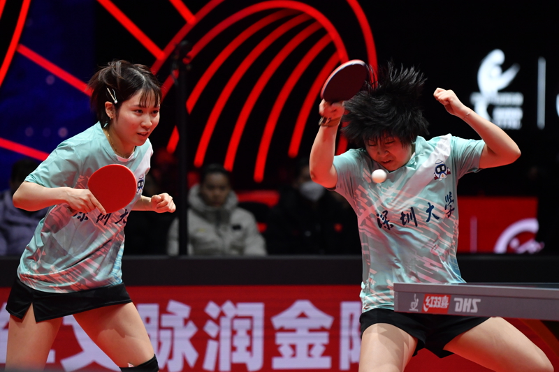 新华社相片,南京,2025年12月28日\n 12月28日,深圳大学队组合蒯曼/平野好意思宇(右)在双打比赛中。她们3比0驯顺山东鲁能队组合陈幸同/钱天一。\n 新华社发(刘臻睿 摄)