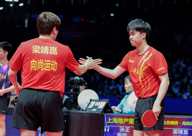 新华社相片,南京,2025年12月27日\n 12月27日,山东魏桥·向尚畅通队组合梁靖崑(前左)/林昀儒在双打比赛到手后庆祝。他们3比0驯顺上海地产集团队组合周恺/孙正。\n 新华社发(刘臻睿摄)